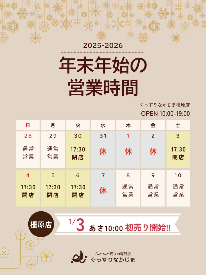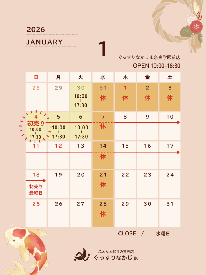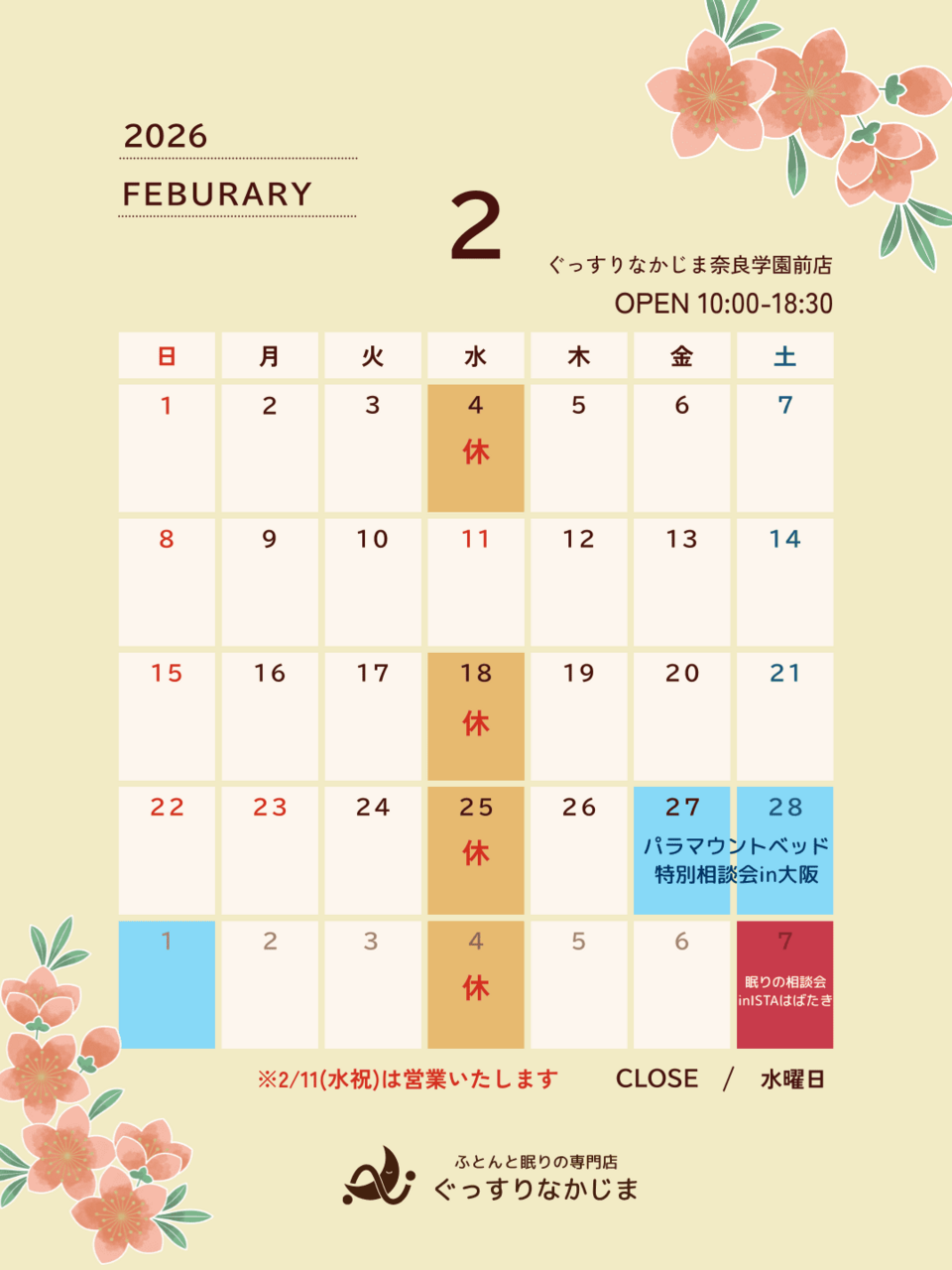 HOME > フェア・お知らせ > お知らせ > ぐっすりなかじま営業日カレンダー《イベント・キャンペーン一覧》