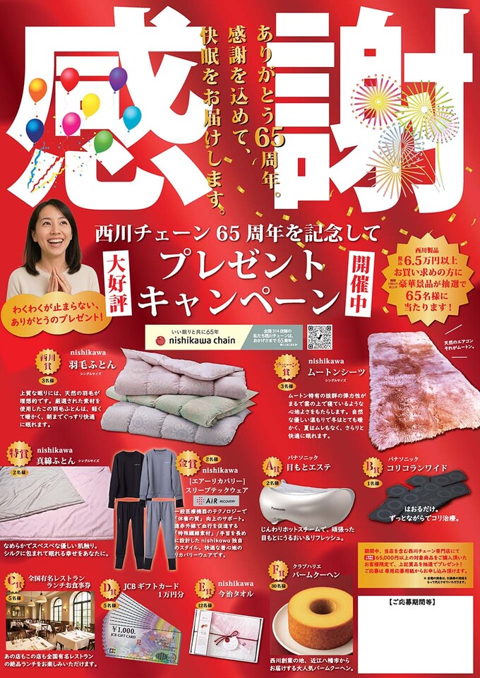イベント詳細 >> - 西川チェーン65周年 感謝のプレゼントキャンペーン