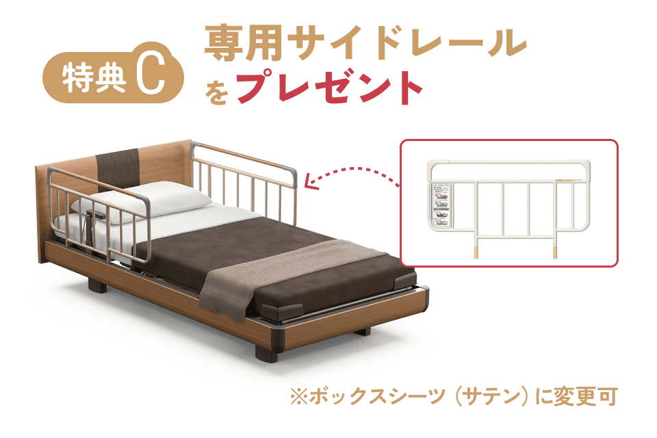 起き上がるとき、座るとき、あると便利なサイドレール。ぐっと体重を乗せて乗り降りしてみてください。