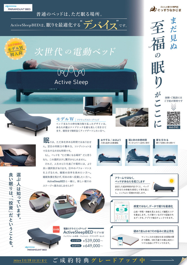 チラシ 【奈良学園前店/12.11~1.18】Active Sleep BED モデルW《初入荷記念》 お電話のお問い合わせはこちら 奈良学園前店:0742-46-2800 10:00~18:30(水曜定休) ※掲載商品と異なる場合がございます。予めご了承ください。 ※在庫状況などは店頭・またはお電話にてお問合せください。