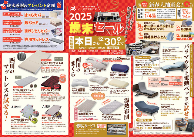 チラシ 【橿原店/12.18~12.30】歳末セール (クリックで拡大) ※掲載商品と異なる場合がございます。予めご了承ください。 ※在庫状況などは店頭・またはお電話にてお問合せください。 じっくり相談するならご予約がおすすめ♪ Web予約はこちらから 不明な点はお気軽にLINEでおたずねください