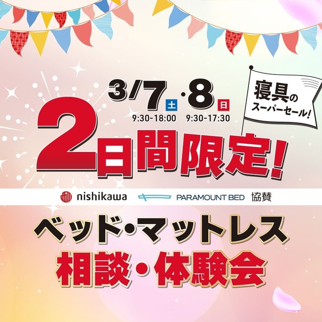 2026 年 3 月 7 日(土) 9:30~18:00/8 日(日) 9:30〜17:30※ぐっすりなかじま奈良学園前店は7・8日とも休業させていただきます。